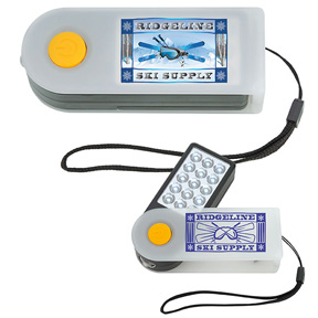 • Plastic Sliding Flashlight. This flashlight is great while you work. Its magnetic side is great if you need light in a room, a closet or in your car. Sliding case to turn on fifteen ultra-bright LED`s. Push button to turn on top light Wrist strap. Magnetic side allowing a convenient 360 degree rotation.