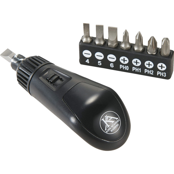 • Perfect for the too bag or keeping in a kitchen drawer. This compact 9 piece ratcheting screwdriver set includes a ratcheting driver and 8 piece bit set with holder. Included bit sizes are slotted 4mm, 5mm, 6mm, 7mm, and Philips PH0, PH1, PH2, and PH3.