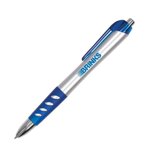 • Sleek design ballpoint pen with a metallic body, color-coordinated clip and vented rubber grip. Features a medium point and black German ink.