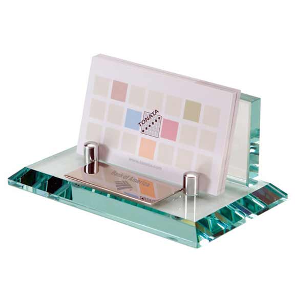 • Elegant jade glass business card holder with silver accent.