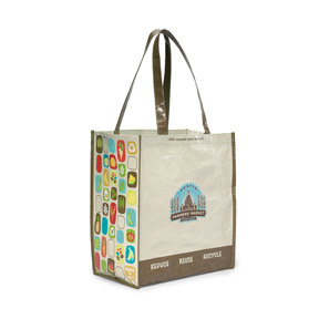 • Laminated 100% recycled PET fabric shopper tote bag. This fashionable tote is laminated to provide maximum durability. Reusable shopping bag is perfect for all your grocery shopping essentials. Large main compartment and generous gussets for maximum capacity. 23.5 shoulder straps.