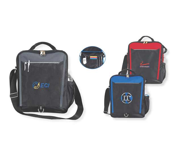 • Front flap closure with matte metal pull and Velcro, slip pocket on flap, organizer pockets under flap, zippered opening on top and sides, elastic side pocket for water bottle or cell phone, adjustable shoulder strap and single carrying handle on top. Rush service only available on a 1 location screen print.