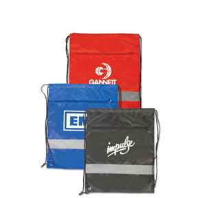 • 210 denier polyester. Features reflective stripe, front zippered pocket and drawstring closure. Stitched seams. Bottom corners reinforced with grommets. Light weight yet durable.