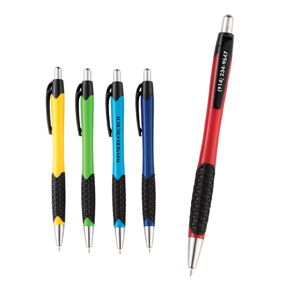 • This vibrant bold colored retractable pen has black textured rubber grips for your writing comfort.