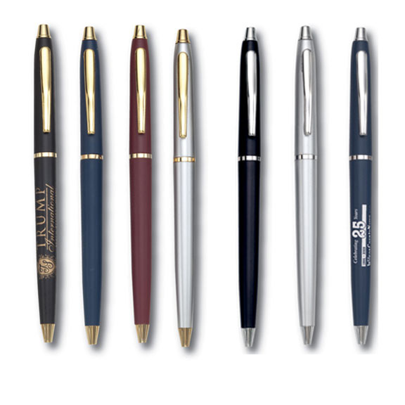 • Twist action ballpoint pen with gold or silver accents. Medium point with black ink.