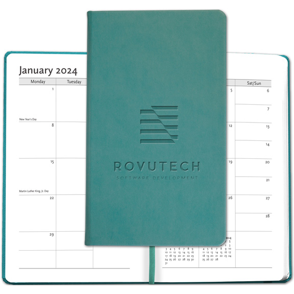 • Soft vinyl hard covers with a sewn book binding. Includes a blind deboss imprint. 80 sheets of ruled, quality wood free paper. Features a pocket on inside back cover, matching satin ribbon bookmark, and elastic privacy closure. Imported. Includes a 12 month, digitally printed calendar at front, 13 sheets. 80 sheets of wood free lined filler.