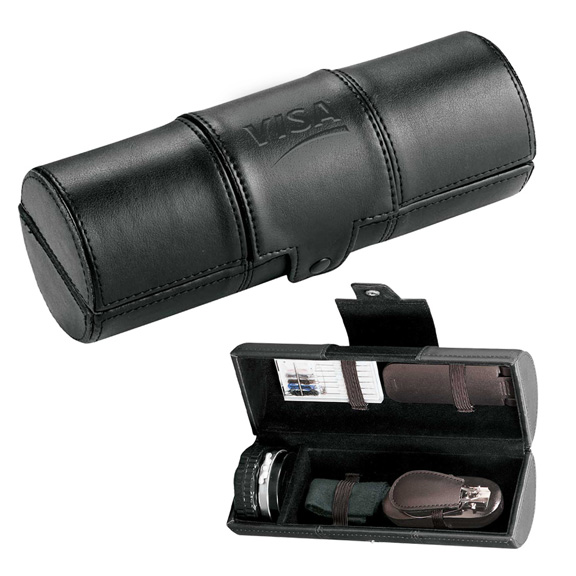 • Eight-piece set includes case, black shoe polish, buffing brush, sewing kit, sponge buffer, lint brush, shoe horn and buffing cloth