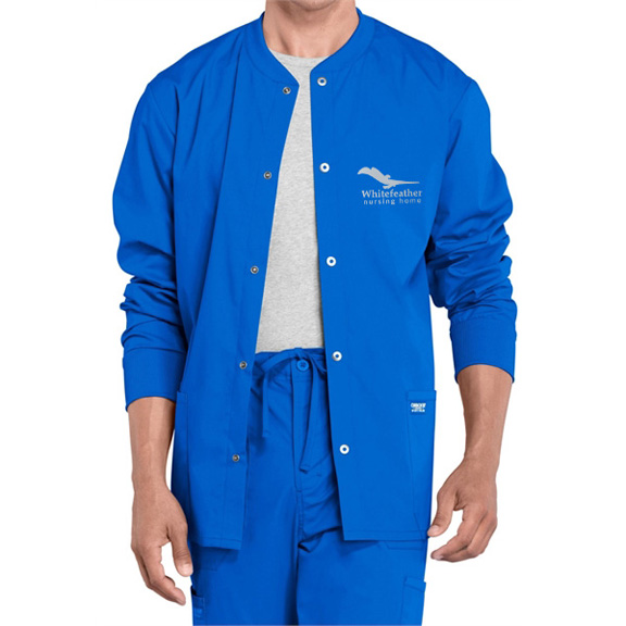 • Add a functional layer over your uniform with this Professionals by Cherokee Workwear Mens Snap Front Warm-Up Solid Scrub Jacket. Knit cuffs and neckline emphasize comfort all day. Knit jewel neckline Snap front closure Long sleeves with knit cuffs Back yoke Two front patch pockets and interior cell phone pocket Side vents at hem