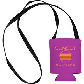 • Classic 12 oz. coolie now with a convenient strap to wear around your neck - keeps your favorite drink within hands reach. Strap hangs approximately 18 inch and is 1/2 inch wide. Great for outdoor events. Collapsible and machine washable for continued use. Made in USA. Complies with Prop 65. 4 W x 4.25 H