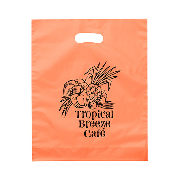 • Hi-density 12" frosted brite color plastic shopping bag with ink imprint, die cut handles and bottom gusset. 2.5 mil thick. Limited ink colors on colored bags. White ink imprint not recommended.