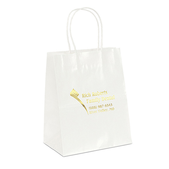 • Gloss white finish 7 3/4 inch paper shopping bag with white twisted paper handles, white interior and serrated cut top.