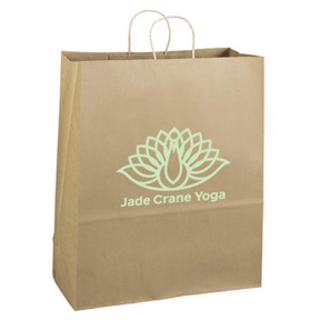 • Brown kraft paper shopper with matching twisted paper handle and fine serrated cut top.  Ink Imprint.
