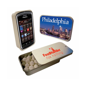 • This white innovative Slider Tin is filled with Signature Peppermints. These slider tins come with a 4-color process laminated decal imprint.