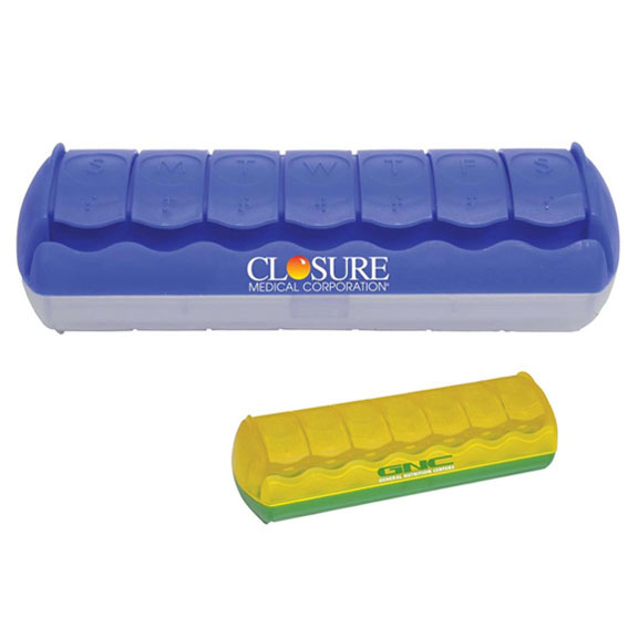 • Modern new twist on this popular product keeps daytime and nighttime pills neatly separated. 14 rounded compartments provide easy access to pills. An angled imprint area make advertising names stand out.