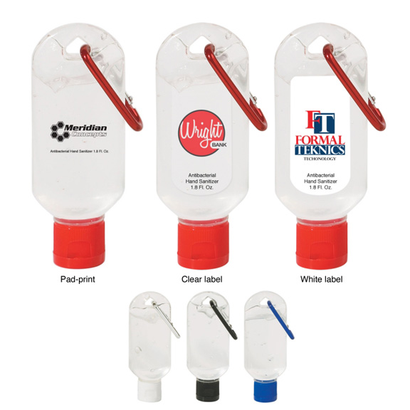 • 1.7 oz - Hand Sanitizer with carabiner. Lightly scented. Effective at eliminating over 99.9 percent of germs and bacteria. Meets FDA requirements. Carabiner clips on to briefcase, backpack and more.