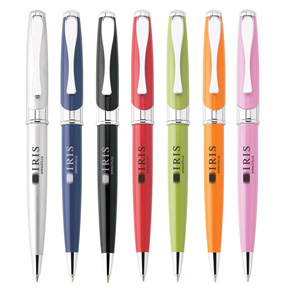 • Draw attention to your message with this stylish writer. Twist-action ballpoint pen features a colorful metal barrel and gleaming chrome clip, tip, and trim. Several vibrant colors to choose from! Lifetime guarantee.