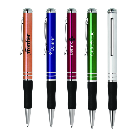 • Aluminum twist action ballpoint with black rubber grip with chrome trims and clips. Laser engraved in matte silver. Black ink. Blue ink available.