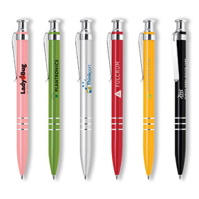 • Click action aluminum constructed ballpoint pen with silver chrome accents. Laser engraved in matte silver. Black ink