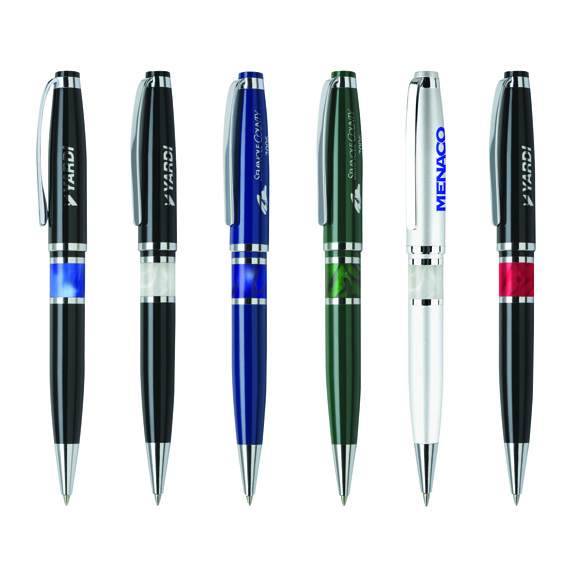 • Twist action chrome plated brass in high gloss lacquer finish with agate look resin center band. Laser engraved in silver. Blue ink.