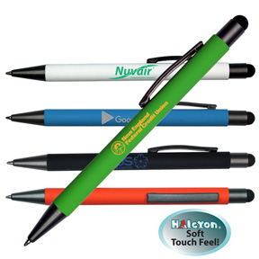 • Sleek soft touch feel barrels. Black ink. Colorful matte barrels. Retractable pen with metal accents. Stylus tip at top of plunger.