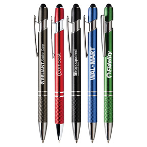• Laser engraved executive pen with stylus makes a perfect gift. Shimmering jewel tones art set off by striking silver tone accents. Elegant diamond etched grip provides writing comfort. Designed for advanced connectivity with all touch screen devices.
