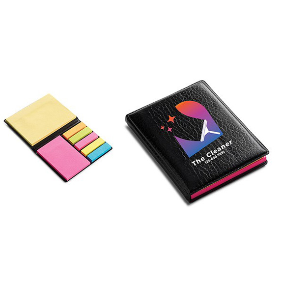 • Black leathette sticky note book. Includes yellow sticky notes, smaller pink sticky notes, and 5 color flags. 50 sheets per color.