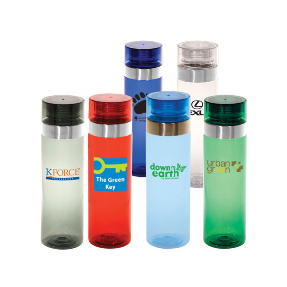 • 27 oz. copolyester water bottle, BPA free. Slim, sleek design with screw top lid.