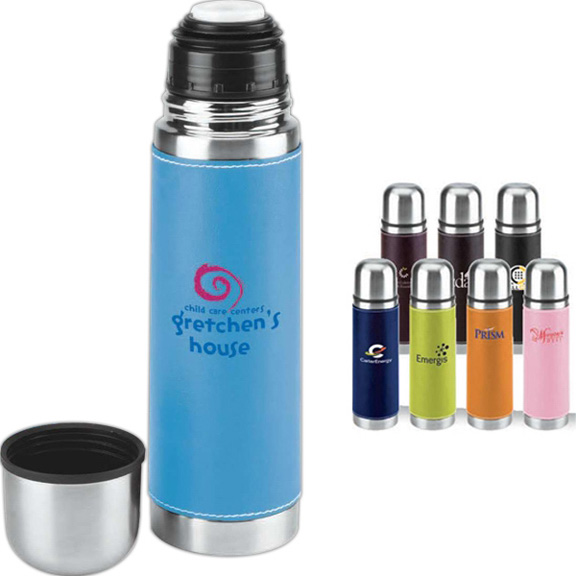 • Leatherette Vacuum Bottle. 16 oz. Stainless steel construction and double wall insulation. The stainless steel lid can be used as a cup. S