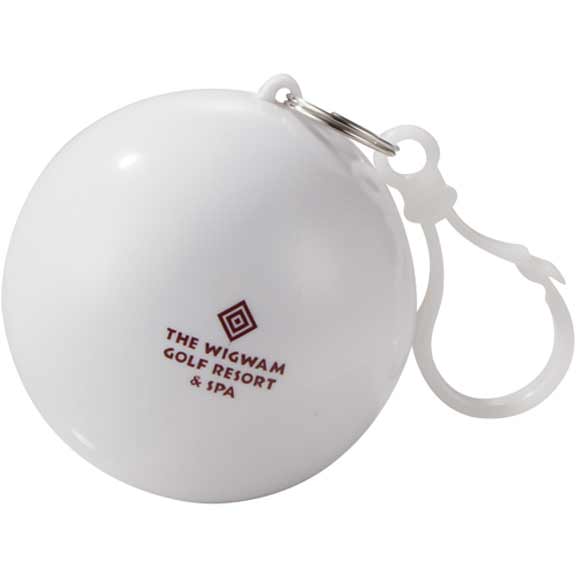 • One-size-fits-all hooded poncho for unexpected downpours. Conveniently compact container hooks onto a keychain, fits into a small pocket, and is a great add-on to any bag or drinkware piece.