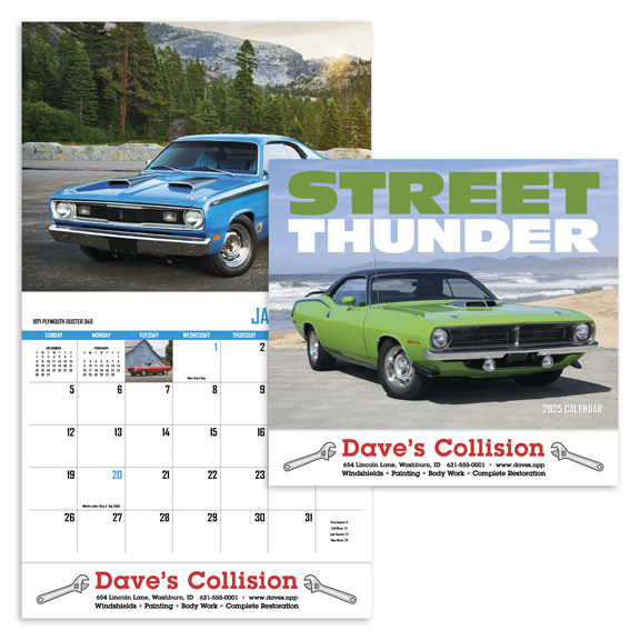 • Street Thunder appointment calendar. 13 month pad in full-color. Quality, recycled gloss stock. Here’s a calendar that’s sure to start your engines. For the true muscle car lover, this one has all the classics. Your power-loving customers will be driven to it all year long.