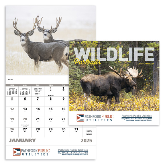 • Stapled Wildlife Portraits 2021 Appointment Calendar. Striking photos of wild animals in their native habitats. 13-Month calendar with Dec 2021 printed on backmount. Gloss Paper Stock with UV Coated Cover. High-quality Imagery. Top markets: financial, utilities, automotive. Material: 60# gloss text/UV-coated cover. .