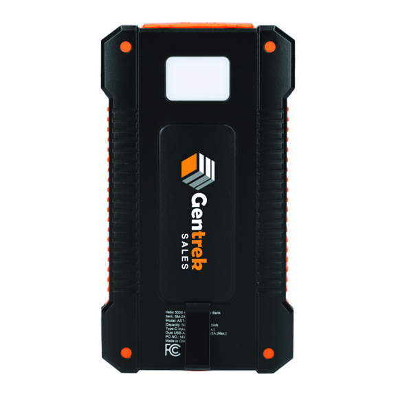 • 5000 mAh 18.5 Wh rechargeable lithium polymer battery. Integrated solar panel, flashlight, and a clip for easy transport. Comes with a 39 inch USB A to Type C cable.