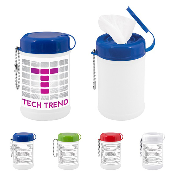 • Travel- or desk-size canister filled with 30 fresh scented alcohol-free antibacterial sanitizer wipes. Includes mini metal bead chain to attach to bag, hooks or belt loops. Active ingredients Benzalkonium Chloride Sanitizer kills 99 percent of germs when used correctly.
