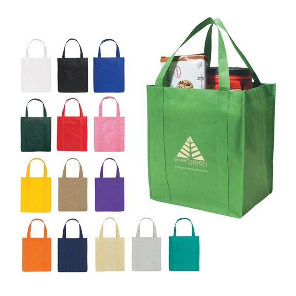 • Recyclable tote bag with reinforced 20 inch handles. Made of 90 gram, non-woven, coated water-resistant polypropylene. Reusable and hand washable. Great for grocery stores, markets, book stores, etc.