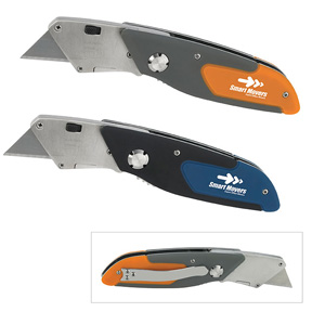 • Cushion grip knife. Plastic blade protector. Belt clip attached. Ideal for your next project. This folding utility knife features a rubberized grip for comfort and safety. The blade folds out and locks in place to provide ease of use. The quick release blade lock ensures easy blade changes.