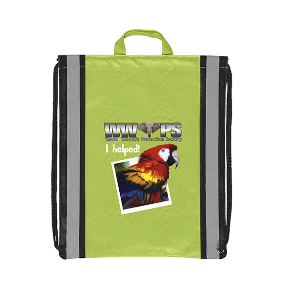 • Constructed of non woven, soft textured heavyweight polypropylene (80GSM) backpack with 1" reflective stripes, black accent draw cords with reinforced corner grommets, and a carry handle. Contains 20% post-industrial recycled material. 100% recyclable and reusable. Reflective stripe backpacks bounce light back from 50 feet. Sturdy carrying handle with cinch closure.