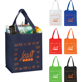 • The Basic Grocery Tote has a large open main compartment and its reusable functionality make it a great alternative to plastic bags. This item does not include a bottom board. 80g Non-Woven Polypropylene