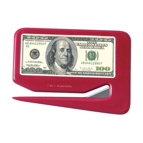 • Cost cutter letter opener. Made in the USA. Stainless steel blade. Choice of 9 U.S. currencies. Front side stock U.S. currency. Made in the USA.
