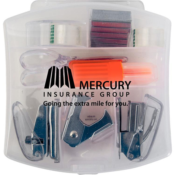 • The portable stationary office kit comes with mini versions of all the things you need in your briefcase. Tape, and tape measure, stapler, and staples, scissors, staple remover, hole punch, and an unimprinted DriMark mini max highlighter. If no highlighter color is specified on order, a yellow highlighter will be used.