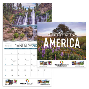 • This calendar showcases the incredible beauty of the United States. Printed in the USA, our collection of dated majestic scenes spreads your year-round promotional message wherever it hangs. Measuring 11 x 10 when closed, this is a great marketing tool for real estate, insurance and travel businesses. Any of your customers who love America will love displaying its wonders along with your brand name. Invest in this timely treasure today