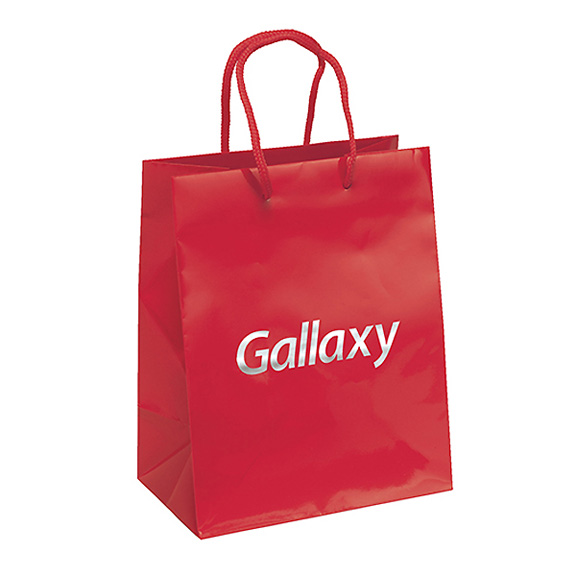 • Gloss 7 3/4 inch laminated paper shopping bag with matching macrame handles, reinforced fold over top, and cardboard bottom insert.
