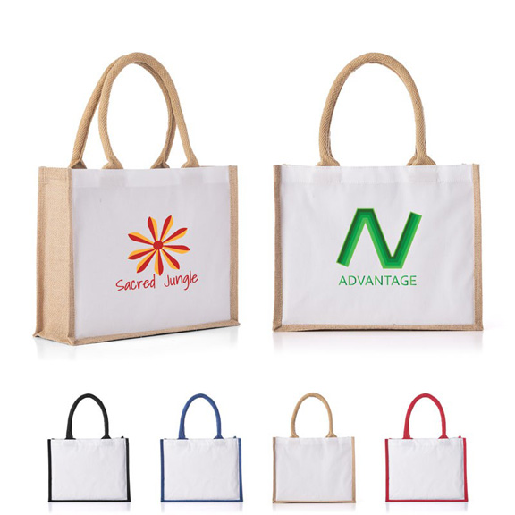• Simple tote bag made of natural fabric. Front panel is white laminated 5 ounce cotton fabric with jute gusset and matching cotton web handles, approximately 16 L. To clean wipe with dry cloth. Recommended weight tolerance is 15 lbs.