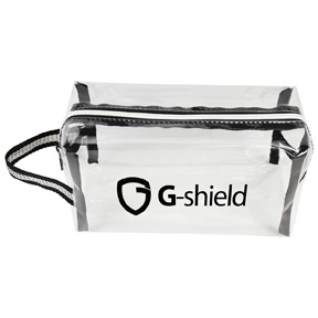 • Clear pouch offers ease of use in organizing and carrying travel essentials. Simple solution for clear bag safety protocols. Zippered main compartment. 7 inch carry strap is black woven braid with light grey accent. Wipeable for easy cleaning.PVC Free.