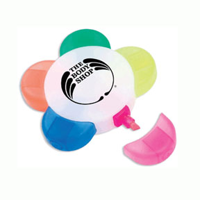 • Highlighter has frosted white circular body with frosted caps of the highlighter colors of green, yellow, pink, orange and blue. The circular white body has room for a large imprint.