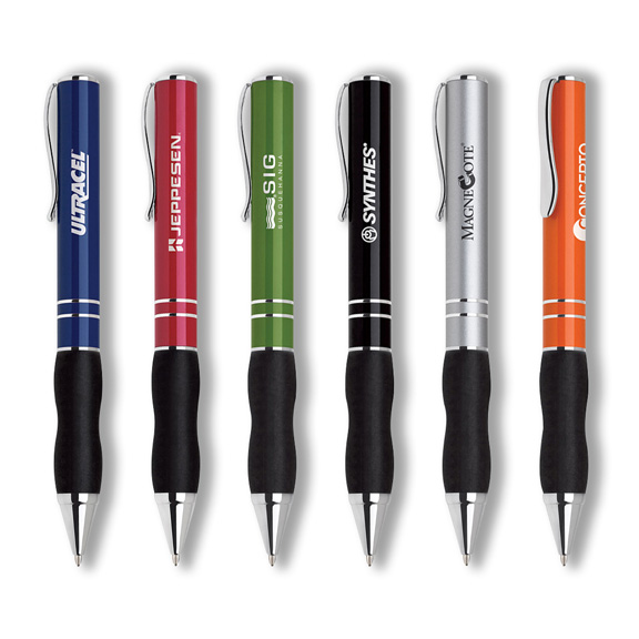 • Contemporary twist action ballpoint pen with comfortable rubber grip and chrome trims. Laser engraved in matte silver. Black ink standard. Blue ink available.