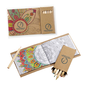 • Color your campaign a success with the adult coloring book and color pencil set. This handy set features a kraft brown paper cover and 32 coloring pages in a variety of stress relieving patterns. The book lets recipients relax, focus, and enjoy the simple pleasure of coloring. This six pencils are pre sharpened, and each set is individually poly bagged. Customize the outer book cover and pencil set with your company logo to create a unique giveaway that recipients will love taking home with them.