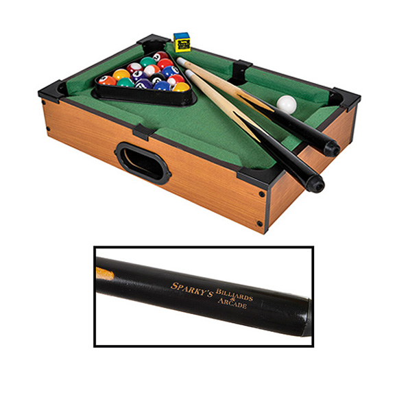 • Never scratch with this table top pool table promotional product in your marketing campaign. This table top set includes: 15 colored balls, 1 cue ball, 2 pool sticks, 1 piece of chalk and a triangle, all packed in an artfully illustrated gift box. Great for gaming conventions, bars, birthday parties and many more! Have your company`s name or logo printed on both sticks. Don’t miss out on this fun and unique promotional product for your next event!