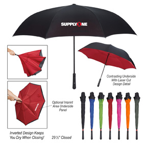 • Manual open. Inverted design keeps you dry when closing. Pongee material. Metal shaft. Contrasting underside. 29 inch closed.