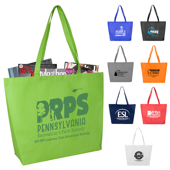• This 80GSM Non-woven polypropylene tote bag is economical, yet sturdy and has 28 5/8 cross-stitched handle straps for extra strength and a handy hook and loop fastener closure. Reusable and Recyclable. Also available with a Full Color Imprint!