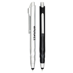 • Plastic barrel ballpoint pen with silicone stylus. Retractable mechanism. Pen and stylus combination at tip. Matte metallic finish.